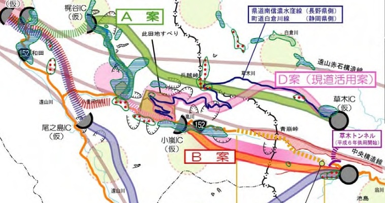 となり何回か引用される平成17年(2005年)発表の報告書の路線候補図[3]から![]() 出典:青 崩峠道路懇談会への報告(国交省中部地方整備局・平成17年) ![]() 出典:青 崩峠道路懇談会への報告(国交省中部地方整備局・平成17年) |